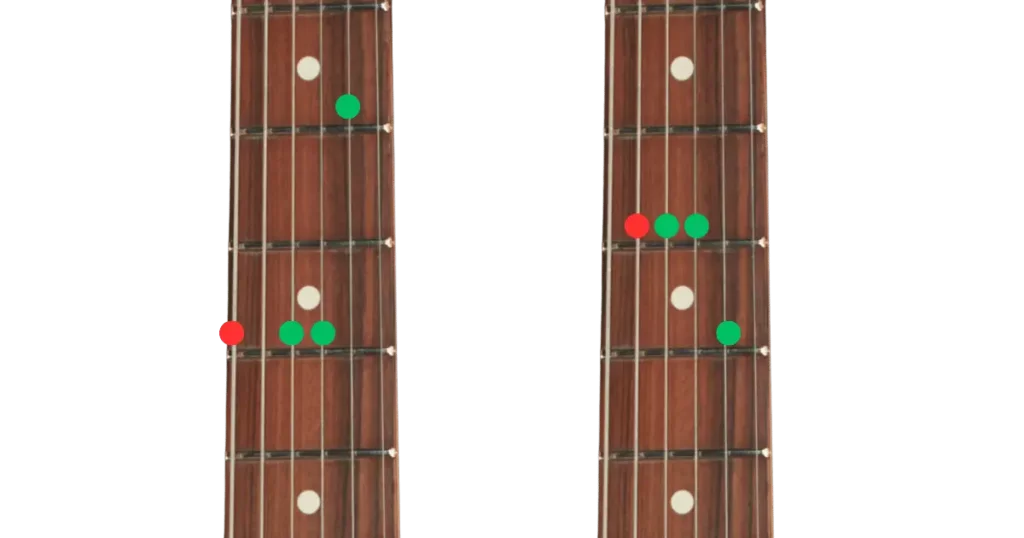 Voici à quoi ressemble l’accord Add 9 avec la fondamentale sur la corde de Mi (à gauche) et sur la corde de La (à droite).
