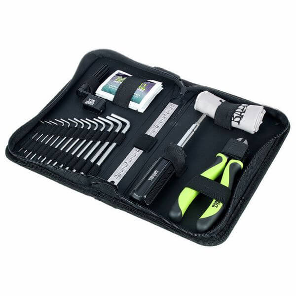 Aujourd’hui, on trouve de nombreux kits “tout-en-un” spécialement pensés pour les guitaristes. Ils contiennent généralement les essentiels : chiffon, clés Allen, pince, tournevis, réglet et parfois même un petit tapis de travail. C’est pratique, surtout si vous débutez et ne savez pas quoi acheter.